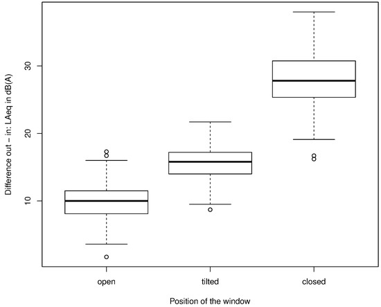 A small influence on the outdoor–indoor differences is attributed to the mean sound level outdoors. It has to be assumed that this finding indicates a limitation of the measurement concept. Despite removing data points without the outdoor–indoor correlation, there might be some measurements with disturbing noises inside that influence the median difference. This effect is bigger in case of closed windows, as described in the next section.