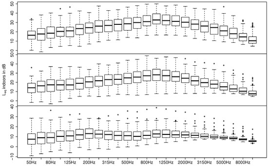 indoors in one-third octave bands for open (top), tilted (middle), and closed windows (bottom) of all valid measurements. Boxplots show the median (horizontal line in boxes), 25% and 75% quantiles (lower and upper boundaries of boxes), whiskers comprising the data within 1.5 times the interquartile range, and outliers outside the whiskers show each one-third octave band.