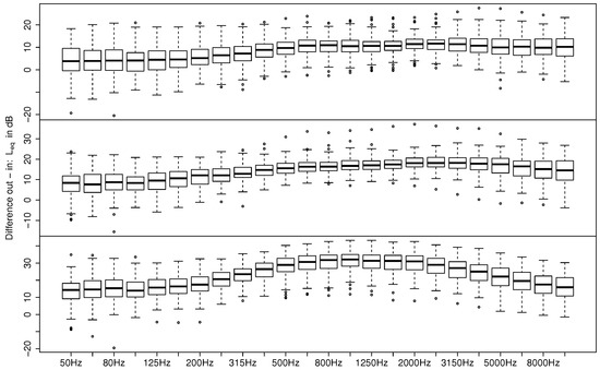 Outdoor–indoor differences for the open (top), tilted (middle), and closed windows (bottom) for all valid measurements. Boxplots show the median (horizontal line in boxes), 25% and 75% quantiles (lower and upper boundaries of boxes), whiskers comprising the data within 1.5 times the interquartile range, and outliers outside the whiskers for each one-third octave band.