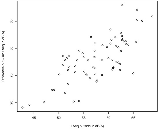 Plot showing the outdoor–indoor differences for measurements with closed windows as a function of the energetically averaged sound level outdoors. Note: In Section 2.1 it was stated that only situations with levels ≥ 50 dB(A) were selected. However, the plot also shows considerably lower levels. This alleged contradiction is due to the fact that measurements were not only performed at the most exposed façades but also at the averted façades. In addition, short-term cannot directly be compared with , as the latter represent long-term averages and also include penalizations.