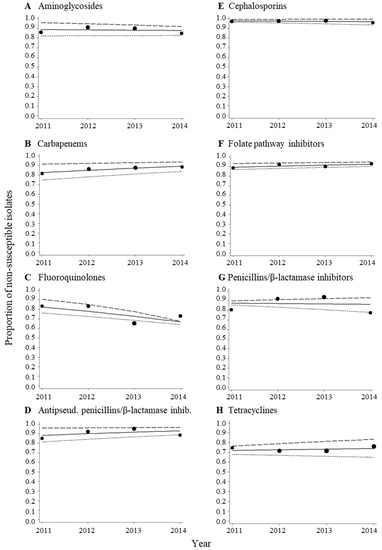 Proportions of non-susceptible Acinetobacter spp. isolates according to antibacterial category and year. The antibacterial categories were aminoglycosides (A, n = 716), carbapenems (B, n = 732), fluoroquinolones (C, n = 578), antipseudomonal penicillins/β-lactamase inhibitors (D, n = 710), cephalosporins (E, n = 722), folate pathway inhibitors (F, n = 456), penicillins/β-lactamase inhibitors (G, n = 675), and tetracyclines (H, n = 405). The data were fitted with a logistic regression model (solid line = all isolates, long dashes = isolates from respiratory samples, short dashes = isolates from all other specimen types). Each bubble shows the proportion of isolates per year. The size of the bubbles represents the sample size (see Table A1). n = total number of isolates in the period 2011–2014.