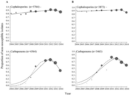 Proportions of E. coli (A) and Klebsiella spp. (B) isolates non-susceptible to cephalosporins and carbapenems. The data were fitted with a piece-wise linear logistic regression model (solid line) and multivariable regression spline procedure (MVRS) (dashed line). Each bubble shows the proportion of non-susceptible isolates to the specific antibacterial category for the years 2004–2014. The size of the bubbles represents the number of isolates tested per year relative to the total number of isolates tested (n) (see Table A1). n = total number of isolates tested for the specific antibacterial category in the whole period.