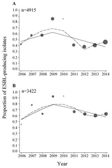 3.3. Trends in ESBL-Producing E. coli and Klebsiella spp. Isolates during the Period 2006–2014