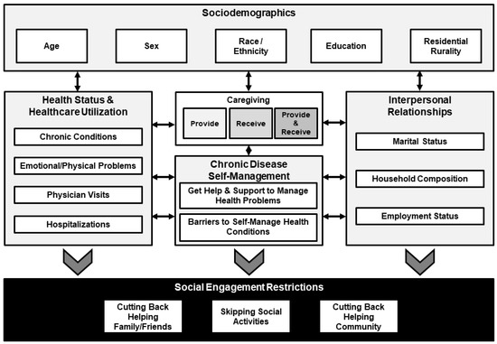 Researchers have examined the health benefits of social engagement by gender and age [13], race/ethnicity [5], marital status [14], caregiver status [15], disability [5], and hospitalization rates [16]. However, limited research examines the impact of these and other factors (e.g., education, rurality, household composition, and employment status) on social engagement among individuals living with chronic diseases. Restricting one’s social engagement, for intentional or unintentional reasons, may lead to social isolation [17], limited physical and cognitive ability over time [18], and an increased risk of death [19]. The purposes of this study were to identify the prevalence of social engagement restrictions among middle-aged and older adults with chronic conditions and examine factors associated with reporting social engagement restrictions. This study is unique in that few studies have examined health-related restricting social behaviors of middle-aged and older adults with one or more chronic conditions. This is especially true among a diverse, national sample self-reporting an array of chronic condition types. Further, this study is unique in that it includes middle-aged and older adults, which offers inclusivity of those with different disease progressions and social structures and responsibilities. Findings from this study have implications to identify risk and reduce engagement restrictions through intervention engagement to promote healthy aging. Figure 1 illustrates the conceptual framework used to guide this study.