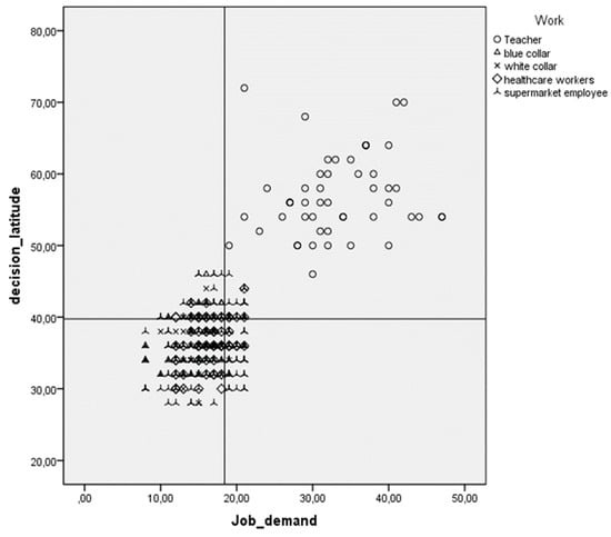 Scores of decision latitude and job demand using Cartesian coordinates were used to split the population into four quadrants (Figure 1). Workers at high stress risk (high strain) in quadrant IV were supermarket employees and healthcare workers.
