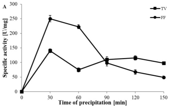 Some proteins may require a longer period than 20 min of time to precipitate, so the optimal time for precipitation was determined within the range from 30 to 150 min [39]. Figure 1A shows that the highest activity for both fungi was assigned after 30 min of precipitation.