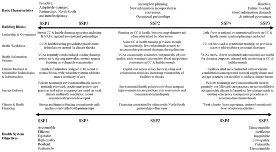 Differences in building blocks across SSPs. Basic characteristics at the top highlight overall differences in management approaches between SSPs. Health system objectives highlights how well each SSP is likely to meet the health system objectives outlined in [15], with SSP1 and SSP3 at the extremes, and SSP2, SSP4, and SSP5 displaying intermediate likelihoods of achieving these objectives.