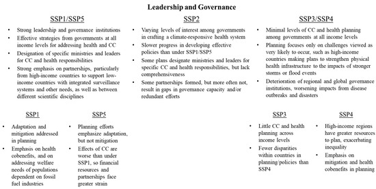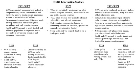 We use the qualitative descriptions provided in SSP background papers, as well as the building blocks and suggested outputs in the WHO framework to illustrate how health system responses are likely to vary under different socioeconomic development pathways. In particular, we take the WHO recommendations as indicative of effective responses, and in general, assume that these will be followed in SSP1 and SSP5. When discussing responses under other SSPs, we assume that responses will be suboptimal based on the WHO framework, in order to draw conclusions about how health systems will less effectively respond to climate change challenges.