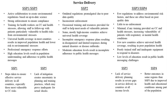 Under SSP3/SSP4, lack of surveillance, as well as a reactive approach to policymaking, result in increasingly polluted food, water, and air, and substantial health risks associated with poor quality waste disposal. Regulations, if they do exist, are rarely enforced and fail to prevent frequent pollution discharges that result in large-scale disease outbreaks. Few health professionals, except those serving the social elite, change their practices as a result of environmental surveillance or similar data, if these data exist. Moreover, population health remains poor in many low- and middle-income countries as few additional countries achieve universal health coverage under these pathways. Because of poor population health conditions and the poor quality of health services provided, climate shocks remain particularly deadly. Finally, emergency preparedness efforts are minimal, with governments reacting to disasters with incomplete information, as well as poorly trained and equipped staff, leading to ineffective responses. In addition, low levels of education make it substantially more difficult to communicate risks to members of the public during disasters, leading many individuals to continue to engage in behaviors (such as using contaminated water or continuing to inhabit an area at risk of storm damage) that place them at high risk of morbidity or mortality.
