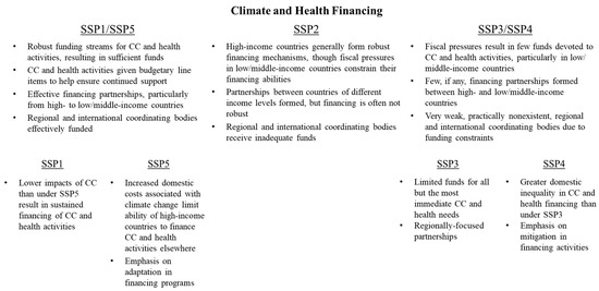 We outline some of the major ways through which health systems are likely to be affected under different SSPs, illustrating that very different health system responses are possible under each pathway, with substantial implications for population health and the mortality distribution. Further research should seek to explore different cases at a variety of scales to examine how different health systems are coping with health and climate change challenges, and to what extent best practices are emerging in this field which can be promoted and adapted by other health systems facing similar challenges. Moreover, efforts to quantify the change in the mortality distribution under different SSPs and by geographic region will provide essential information for policymakers seeking to understand how to best allocate health resources in a world stressed by climate change. Such quantifications also should include temporal considerations, such as what could be the range of characteristics of health systems in the 2030s, when the increase in global mean surface temperature will be about 1.5° above pre-industrial temperatures. These quantifications would inform modeling of the health risks of climate change, to support policy development within and outside health systems that promotes sustainable and resilient health systems in a changing climate.