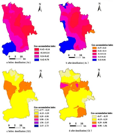 Spatial distribution maps of the geo-accumulation indices of As and Cd before and after densification. The classification of the geo-accumulation index was obtained by using natural break interval approach. (a) The geo-accumulation index of As before densification; (b) the geo-accumulation index of As after densification; (c) the geo-accumulation index of Cd before densification; (d) the geo-accumulation index of Cd after densification.