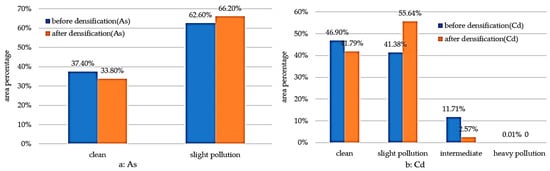 Statistics of each pollution level before and after densification. For As, the pollution grades were clean and slight pollution. For Cd, the pollution grades were clean, slight, intermediate, and heavy pollution. (a) The area percentage of each pollution level before and after densification of As, respectively; (b) the area percentage of each pollution level before and after densification of Cd, respectively.