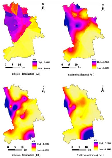 In Figure 4a,b are the mean square error values of the geo-accumulation indices of As before and after densification, respectively. Based on the interval range of the error, the maximum MSE after densification is less than half the value before densification. The interval range decreases by a large magnitude. In the spatial distribution, the spatial variation of the MSE after densification is much smoother. The overall distribution configurations are similar. Figure 4c,d are the square errors of the geo-accumulation indices of Cd before and after densification, respectively. Based on the interval range of the errors, the maximum MSE after densification is 3.2368, larger than before densification. The interval range increases. On the spatial distribution, the high error values after densification decrease to a certain degree in the northwest of the region. However, the error further concentrates in the fan region in the southeast of the region, and the area increases significantly. The error configurations in the other regions are similar.