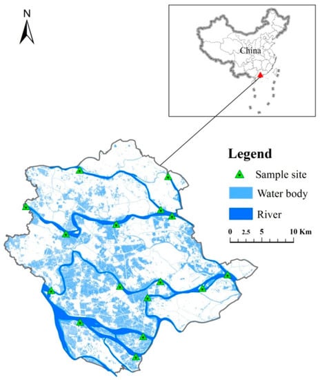 The spatial distribution of the 16 sample sites in study area of Shunde district.