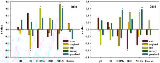 Pearson relationships between water quality and land use types within the 2000 m buffer in 2000 and 2010. “*” and “**” refer that the coefficients (r) are significant at the 0.05 level and at the 0.01 level, respectively.