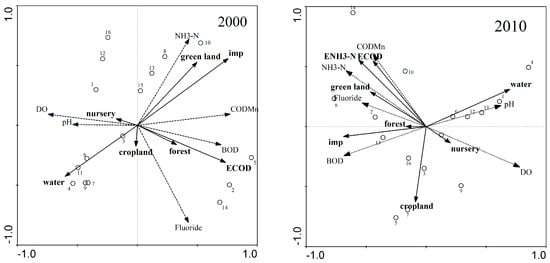 In Figure 3, redundancy analysis results of land use and water quality are presented. CODMn and NH4-N concentrations were closely related to the proportions of urban green and impervious land and BOD was closely related with COD emission and proportion of forest in 2000. CODMn and NH4-N were closed related with COD and NH4-N emissions and urban green and impervious land in 2010.