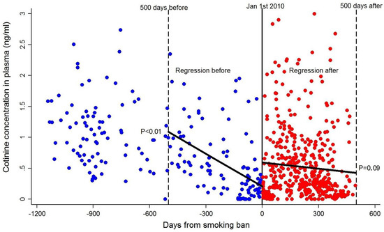 Levels of cotinine among non-smoking (i.e., cotinine levels ≤3 ng/mL) pregnant women before (N = 200, mean = 0.78, SD = 0.60) and after (N = 468, mean = 0.52, SD = 0.55) implementation of the 2010 smoking ban. Data are plotted from the exact day (2 January 2010) that the ban was implemented. Results from the regression discontinuity analyses are also displayed. Restricting the data to 500 days before the ban (N = 114) and 500 days after the ban (N = 464), results indicate a significant decline in cotinine values in the days prior to implementation of the smoking ban and a non-significant decline following the ban.