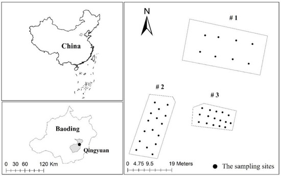 The study sites are in a suburb with an abandoned factory in southern Baoding, Hebei province, China, where small non-ferrous metallurgy enterprises are densely distributed. Three sites were investigated: site #1, site #2, and site #3 (shown in Figure 1). Based on a previous field survey, site #1 was in a natural area never used for industrial activities and waste depositions. Site #2 was abandoned for almost 20 years and characterized by the presence of slag from lead pyrometallurgy. Site #3 was abandoned for eight years and characterized by the presence of waste residue of zinc hydrometallurgy. The study area has a temperate continental monsoon climate with four distinct seasons; the annual dominant wind directions in Baoding are northeast/southwest (NE/SW), and its perennial average wind speed generally ranges between 4 and 6 m/s. The annual average precipitation is 550 mm, and the annual mean temperature is 12 °C. The main sources of soil pollution are metallurgy, chemical plants, electroplating, textile, and paper industries.