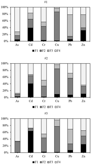 The toxicity and mobility of PTEs were not only related to their total concentrations, but also their chemical speciation, their binding state, the metal properties, environmental factors, and soil properties like pH, OM content, and soil type [39]. The F1 of PTEs refers to exchangeable PTEs, which can be easily desorbed and migrated with water through soils and are sensitive to changes in soil pH. The F2 referred to metal associated with Fe and Mn oxides that was reducible, which might be released when subjected to more reducing conditions. The F3 referred to metal bound to OM that might be released under oxidizing conditions. The F4 is determined to be a stable fraction, which may be held in a primary and secondary mineral crystal structure and could not be affected by the environment [40]. Different fractions of PTEs in the soils have different biological effectiveness. The order of the bioavailability of metal fractions was F1 > F2 > F3 > F4. To determine the bioavailability of PTEs in the soils, the modified BCR was conducted, and the results are shown in Figure 2. For Cd and Zn, the F1 at sites #2 and #3 was much higher than that at site #1 because of the very high anthropogenic discharge concentrations, which indicates higher leaching toxicity and potential harm to the eco-environment. Generally, PTEs in F1 are bound to carbonates in the weakest strength and could be absorbed by the biota directly. In general, anthropogenic Cd and Zn are preferentially associated with carbonate minerals because of their similar ionic radius [41]. Cd ions or Zn ions could readily substitute for Ca ions in the carbonate-bound fraction [42]. Therefore, the higher proportions of Cd and Zn in the F1 might lead to deeper downward migration. In contrast, the elements of Pb at the three sites were mainly associated with the reducible forms (F2) and (F3), indicating relatively less mobility and bioavailability and a minor hazard to the eco-environment. The dominant phase of As and Cr in the top soils of all three sites was the residual fraction (Figure 2), which is bound in the mineral lattice. The availability of As, Cr, and Zn from the residual fraction is scarce; therefore, they are expected to be less harmful to biota. Cu in the top soils of three sites and the element of Pb at site #2 were dominated by the reducible fraction, indicating these two elements’ strong association with Fe/Mn oxides, from which Cu could be released into the water column under reduced conditions.