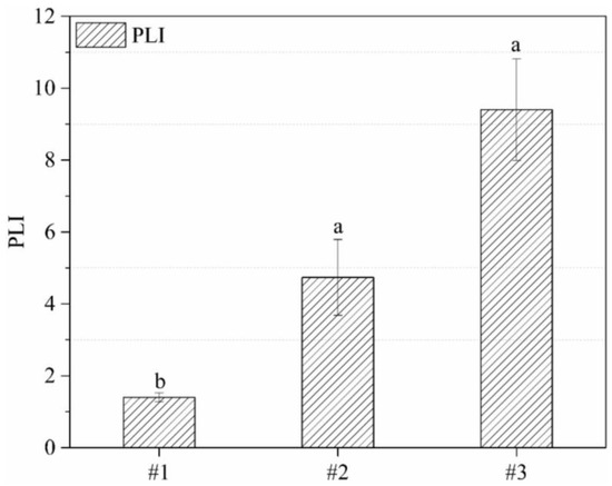 The PLI is proposed as a standardized system for assessing the overall pollution status that permits a comparison of pollution levels between different sites. It was first used for quantifying the estuarine quality in the simplest way [44] and is generally used for sediments assessment [45,46] and soil pollution impacts [47]. In this study, the PLI was computed to quantify the comprehensive toxicity status of three rural waste sites. The mean PLIs of the PTEs in the top soils of sites #1, #2, and #3 are shown in Figure 3.