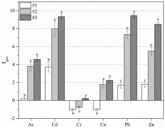 Igeo considers the human factors, geochemical background values, and the impact of diagenesis on background values, which directly reflect the degree of PTEs and the metal enrichment in soil. As shown in Figure 4, at site #1, the results of Igeo indicate no pollution by Cr or Cu, low As pollution, partial median pollution by Pb and Zn, and partial serious Cd pollution. These results indicate that Cd, Pb, and Zn concentrations are heavily affected by anthropogenic inputs, surface runoff, and dust from nearby contamination sources, while Cr and Cu were mainly of geochemical origin. At site #2, the mean Igeo of six PTEs indicate no Cr pollution, partial median Cu pollution, as well as partial serious-to-severe pollution by four PTEs (Cd > Pb > Zn > As > Cu). At site #3, the mean Igeo of four PTEs is greater than 4 (Pb > Cd > Zn > As > Cu), indicating significantly high pollution levels; the mean Igeo of Cu is 2.02, and the mean Igeo of Cr is slightly higher than zero (Figure 4). The results of Igeo indicate that site #1 was practically unpolluted to moderately polluted, while sites #2 and #3 were both heavily polluted by anthropogenic inputs of Pb, Zn, Cd, and As, and Cr was mainly of geochemical origin [48]. The results show little difference between sites #2 and #3, owing to their similar raw material (copper lead-zinc ore) for metallurgy. However, the OM and pH were significantly different (p ≤ 0.05) between sites #2 and #3. The results indicated that Cd at sites #3 showed geo-accumulation in an acid condition. Fine grain sediments and more OM facilitate the accumulation of more PTE contents. Therefore, sites #2 and #3 with higher OM may increase the Pb accumulation [49].
