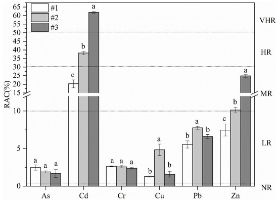 Generally, PTEs in the F1 are bound to carbonates by relatively weak electrostatic interactions and could be more rapidly absorbed by biota [50]. Therefore, the percentage of PTEs introduced by anthropogenic activities in F1 could indicate a potential migration risk for PTEs to the eco-environment [51]. The RACs of six PTE elements at sites #1, #2, and #3 are displayed in Figure 5.