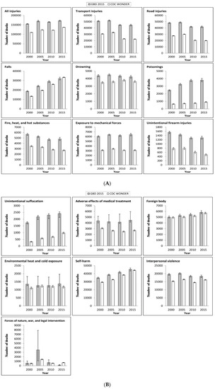 We focused our analysis on injury outcomes, which offer an objective health outcome that is the leading cause of death for U.S. citizens between the ages of 1 and 44 years. We focused our analysis on the United States because it is the only nation we identified that is reputed to have accurate health data and that provides publicly available, online, and code-specific injury mortality data in English or Chinese to allow for comparisons using the injury classification system defined by the GBD group. Our study compared injury death statistics from the United States (U.S.) CDC Wide-ranging Online Data for Epidemiologic Research (CDC WONDER) with those from GBD 2015 estimates.