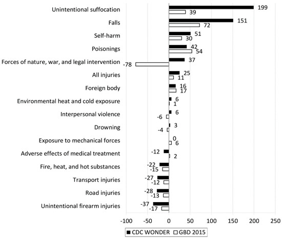 Difference in injury deaths from the GBD 2015 and CDC WONDER (U.S., 2000–2015).