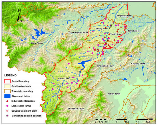 In spite of its importance as Ningbo’s primary drinking water source, the basin is among the most industrialized cities in China, experiencing serious freshwater pollution problems over the past three decades that threatens water environment and drinking water security [22,23]. The primary water pollutants found in the water are chemical oxygen demand (COD), NH3-N, and total phosphorus (TP). The poor water quality was attributed to the industrial plants, residential sewage, agricultural run-off, large-scale livestock culture, and wastewater treatment plant discharges (Figure 1) within the basin.