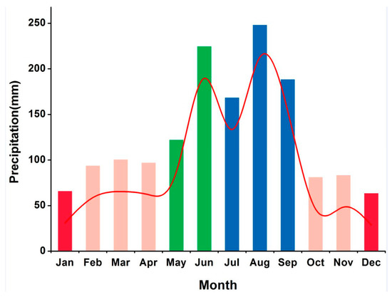 The average monthly rainfall over the last 15 years (2000–2014) recorded at the three rain gauge stations in the Hong-Jia-Ta catchment with the area of 151 km2 near the basin shows a bimodal pattern (Figure 2). The monthly average precipitation over the last 15 years ranged from 50 mm in the winter season to 250 mm in the summer season. The heaviest rainfall (more than 248 mm) occurred in June and August; July and September also received high rainfall, while the minimum rainfall occurred in December with only 63.53 mm. Rainfall intensity in the dry season, plum rain and typhoon seasons were 129.42 mm, 346.76 mm, and 604.99 mm respectively, accounting for 8.42%, 22.56%, and 39.36% of the annual total precipitation.