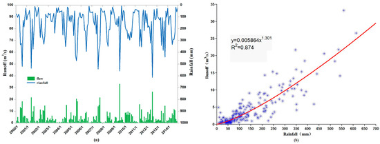 The correlation between rainfall and runoff: (a) Monthly change of rainfall and runoff during the last fifteen years; (b) Fitted equation of precipitation and runoff y = 0.005864x1.301, R2 = 0.874.