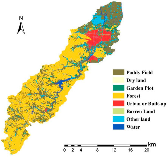 The pollution sources in the basin were identified mostly from agricultural non-point sources, large-scale breeding farms, domestic sewage, industrial enterprises, and a wastewater treatment plant. The load from the first two sources was computed by using Johnes model (Equation (2)) [26]. The rate loss of various agricultural non-point sources loads (paddy field, dry land, economic forest, and garden) was determined based on previous studies citing analogy basins [27,28,29]. For the domestic sewage, there are primarily three mechanisms to discharge pollutants into rivers, according to a field survey and a review of previous studies: (1) sewage pipes divert effluence into rivers and streams after a treatment by sewage disposal facilities in villages; (2) the effluent is discharged directly into rivers and streams after a simple treatment by septic tanks; and (3) all others are all discharged into a sewage network and eventually enter sewage treatment plants before being discharged into streams and rivers.