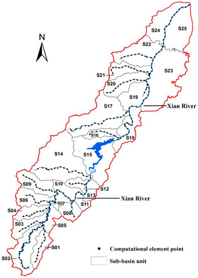 For advantageous analysis of WEC, the watershed area was divided into 25 sub-basins (S01–S25). The hydrologic network was extracted from the digital elevation model (DEM) data, using the function of hydrologic analysis in ArcGIS 10.2 (version 10.2, ESRI Inc., Redlands, CA, USA), where there was one main stream (Xian River) and fourteen tributaries (Figure 5). Each reach was then subdivided into uniform computational elements for the model. These were 100 m in size, almost ten times more than the average calculation precision, and the reaches were divided into 1350 segmentations in total. The properties of the segmentations (length, width, sides slope, channel gradient, and elevation) were measured or estimated using ArcMap 10.2 (version 10.2, ESRI Inc., Redlands, CA, USA). The serial numbers of sub-basins and computational elements are displayed in Figure 5.
