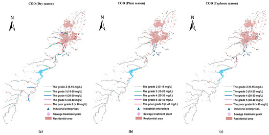 The space–time distribution of COD water quality standard for the Xian-Jiang Basin: (a) concentrations in the dry season; (b) concentrations in the plum rain season; and (c) concentrations in the typhoon season.