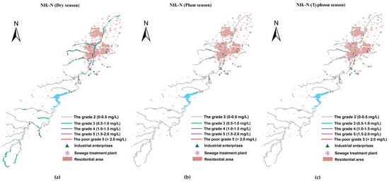 The space–time distribution of NH3-N water quality standard for the Xian-Jiang Basin: (a) concentrations in the dry season; (b) concentrations in the plum rain season; and (c) concentrations in the typhoon season.