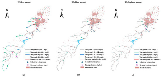 The space–time distribution of TP water quality standard for the Xian-Jiang Basin: (a) concentrations in the dry season; (b) concentrations in the plum rain season; and (c) concentrations in the typhoon season.