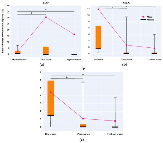 The WEC of 24 sub-basins (excluding the S15 where the reservoir is located) as a group of subjects has been calculated for different hydrological seasons (dry season, plum rain season, and typhoon season), respectively. If the calculations of WEC were positive, it means the environmental capacity remained in surplus and could still accommodate the pollution load into the river with the premise of not violating the water quality standard. The positive values were replaced by zero indicating that no load needed to be cut; negative values indicated that the pollution load exceeded the environmental capacity and were replaced by its absolute values standing for the quantity that needed to be reduced. The independent-samples nonparametric statistical analyses with Mann–Whitney U tests were performed to assess group differences of the reduced WEC among the three hydrological seasons (Figure 10). A significance threshold of p was set as 0.001 and obtained from tables describing the critical values of test results using SPSS 18.0 software (version 18.0, IBM, Armonk, NY, USA).