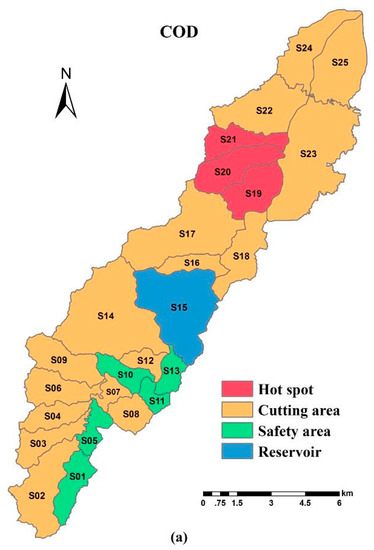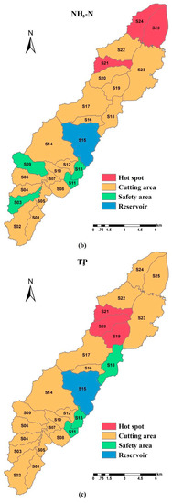 The most polluted dry season was selected as the study period. The quantity of reduced WEC per unit area of contaminants in the 24 sub-basins was calculated (Table 2) and the descriptive statistics were described as per Table 3. The spatial pattern of hot spots and safety areas within the basin was shown in Figure 11 (Hot spots represent the areas with the top three WEC reductions; Cutting area represent the area needed to be reduced; Safety area represent the area with no need to cut). The distribution pattern of hot spots for COD and TP were exactly the same (S19, S20 and S21) and were the industrial and populated clusters, while they were mainly distributed in populated areas (S24 and S25) for NH3-N. These were the key regions of environmental management. Nearly all safety areas were located in upstream watershed of the reservoir where the water source conservation area is located. The average reduction of 24 sub-basins for the COD, NH3-N, and TP pollutants was 24.07 t/a, 1.12 t/a, and 0.73 t/a, respectively. Among them, the largest reduction for COD was in S19 with up to 132.95 t/km2·a−1; however, there were five sub-basins with a minimum of 0.00 t/km2·a−1, including S01, S05, S10, S11, and S13, indicating that there was still room to admit pollution loads in these regions. The most and least reduced regions for NH3-N were S21 (9.69 t/km2·a−1) and elements of S03, S09, S11, and S13 (0.00 t/km2·a−1), presenting a wide range of differences among the elements. Furthermore, S19 and S21 were the areas with the most TP reductions (2.07 t/km2·a−1) and the areas of S11, S13, and S18 still had a remaining environmental capacity (0.00 t/km2·a−1). As for statistical parameters of variation, the standard deviation of the reduced WEC for COD, NH3-N, and TP in the 24 sub-basins were 37.07 t/km2·a−1, 2.28 t/km2·a−1 and 0.61 t/km2·a−1, respectively, and the variation coefficient of the contaminants reached 154.01%, 203.57%, and 141.86%, respectively, the variability of which belonged to high levels [40]. Thus, the reduced WEC dramatically exhibited a spatial difference between all divisions of the basin during the dry season.