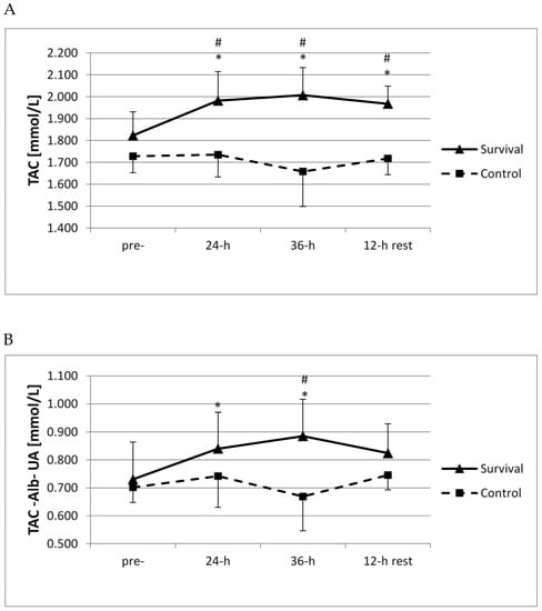 Changes in total antioxidant capacity (TAC) of plasma (A) and antioxidant capacity of plasma without albumin (Alb) or uric acid (UA) (B) in control group (n = 11) and survival group (n = 12). Values are means ± SD. Main effects for TAC: group (p = 0.00001); group × time (p = 0.005); Main effects for TAC-Alb-UA: group (p = 0.001); group × time (p = 0.04); * significant difference (p < 0.05) as compared to pre-training (within same group); # significant difference (p < 0.05) between survival and control groups (at same time point).
