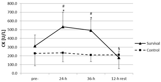 Changes in plasma activity of creatine kinase (CK) (U/L) in control group (n = 11) and survival group (n = 12). Values are means ± SD. Main effects: time (p = 0.000001); group (p = 0.005); group × time (p = 0.000001); * significant difference (p < 0.05) as compared to pre-training (within same group); § significant difference (p < 0.05) as compared to pre-training, 24-h, and 36-h (within same group); # significant difference (p < 0.05) between survival and control groups (at same time point).