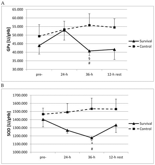 Changes in the activity of antioxidant enzymes in control group (n = 11) and survival group (n = 12). (A) Changes in whole blood activity of glutathione peroxidase (GPx) (U/gHb). Values are means ± SD. Main effects: group (p = 0.038); § significant difference (p < 0.05) as compared to 24-h (within same group); # significant difference (p < 0.05) between survival and control groups (at same time point); (B) Changes in erythrocyte activity of superoxide dismutase (SOD) (U/gHb). Values are means ± SD. Main effects: group (p = 0.045); * significant difference (p < 0.05) as compared to pre-training (within same group); # significant difference (p < 0.05) between survival and control groups (at same time point).