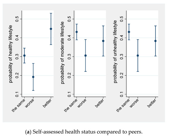 All characteristics were presented as frequencies with a percentage distribution. Associations between lifestyle category and characteristics such as age, residential place, physical activity at work or school, BMI categories, and self-assessed health status were verified using a χ2 test. To assess if women’s lifestyle choices could be independently influenced by the above-mentioned factors a multinomial logistic regression was used. First, simple multinomial logistic regression models with only one independent factor were presented. Then, they were followed by one multiple multinomial logistic regression model with all the studied factors. Predicted probabilities (with 95% confidence intervals) of choosing a healthy, moderate, and unhealthy lifestyle were based on multiple multinomial logistic models which were calculated for each category of self-assessed health status, place of residence, and physical activity at work/school, holding all other variables at their means.