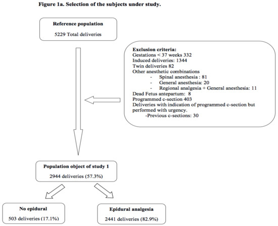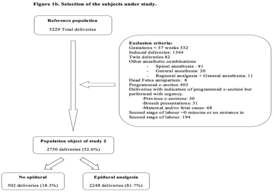 The reference population is composed of a group of pregnant women who receive care during childbirth in the Mancha-Centro District Hospital, from 2012 to 2016. All planned surgical deliveries (caesarean sections), gestations under 37 weeks, induced delivery, twin gestations, and other combinations of analgesic techniques other than the exclusive use of EA were excluded. We excluded other analgesic combinations so as to know the influence of epidural analgesia and to avoid confounding bias. With these criteria of exclusion, the study population 1 was staked out (Figure 1a). But due to the duration of the second stage of labor is a potential risk factor for NM and many pregnant women did not reach the second stage of labor because they underwent a caesarean section in the first stage of labor, a study population 2 was created where pregnant women who did not reach the second stage of labor were excluded (Figure 1b).