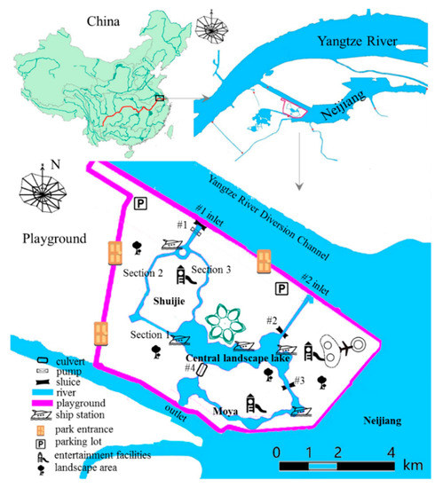 Zhenjiang Magic Ocean World project is surrounded by water on three sides, north of the navigation channel west coast, south of the original pilot diversion river, southeast of Neijiang Lake. The water system of Playground Lake, the water conservancy project and surrounding land use situation are shown in Figure 1. The total construction area of Zhenjiang Magic Ocean World project is 101,050 m2 [45]. The main construction items include Playground Lake, Ocean World, Water Tourism Center and other tourism facilities, among which the Playground Lake is made up of #1, #2 and #3 sections of Shuijie, central landscape lake and Moya, flood control runs and ecological dispatch through three sluices and one culvert [46].The average COD concentration of Playground Lake is 3.03 mg/L, the average ammonia nitrogen concentration is 0.15 mg/L, the mean total phosphorus concentration is 0.039 mg/L, the mean total nitrogen concentration is 1.182 mg/L and the average Chl-a concentration is 0.016 mg/L. According to Surface Water Class III standards [47,48], the concentration of COD, ammonia nitrogen and Chl-a meet the standards; the standard rates of total phosphorus and total nitrogen are exceeded by 27.3% and 66.7%, respectively.