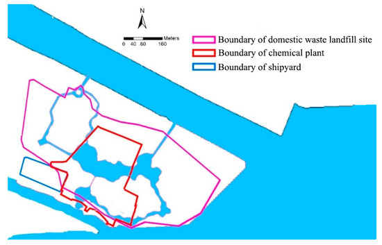 At present, there are mainly three pollution areas in the study area, namely Chemical Plant, Shipyard, and Domestic Waste Landfill Site. As shown in Figure 2.