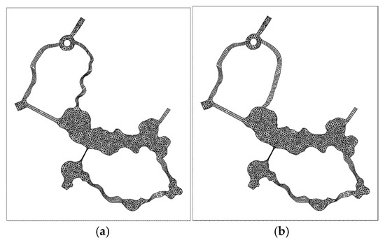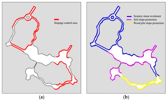 - “Roughed” river: roughly handle the Shuijie 2 and the ring lake (planted with plants, retaining walls and other “soft isolation” devices). To improve the flow ratio of Shuijie 2 and 3, so as to allow more water to enter the Shuijie 3. The layout of the river is shown in Figure 9b.