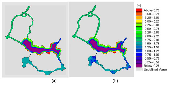 Model boundary conditions: The initial water level was set at 2.67 m. The temperature was 28 °C. The initial flow rate was set to zero [42,43,44]. The initial water head Δh (the water head between the Yangtze River and the Playground Lake) was 0.2–0.3 m. The flow rate of water diversion through sluice at #1 inlet and #2 inlet were 8.27 and 1.82 m3/s, respectively.
