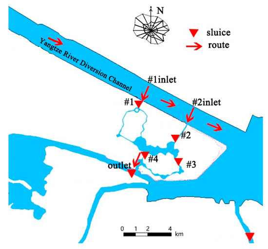 During the high tide of spring-tide of the Yangtze River, the water level of the Yangtze River is higher than that of the Neijiang Lake, with a 0.3 m sluice. Water will be diverted into the Playground Lake by gravity to improve water quality and eutrophication by the use of water head between the #1 inlet, #2 inlet and outlet (Figure 5).