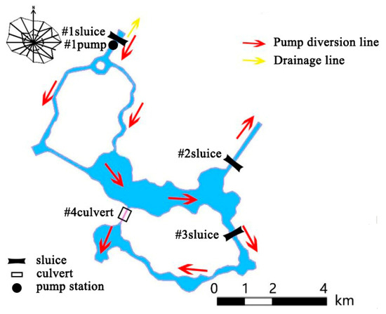 Through the #1 pumping station, the diversion water will enter the playground to improve its water quality and eutrophication status. The position of “three sluices and one culvert” is shown in Figure 6. The specification parameters are given in Table 3.