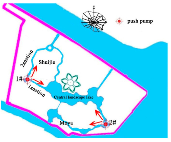 - In the layout of the “unilateral river” and “bilateral rivers” schemes, TP and TN meet the requirements of landscape and recreation by the water diversion, and the overall water quality meets the requirements. Spring and summer correspond to the tourist season and the light temperature is appropriate, the degree of eutrophication heavier, while in winter it is lighter. In the absence of water diversion during summer, the entire wading area under the “unilateral” and “bilateral” rivers is under mild eutrophication. In winter, due to the low temperature, light intensity and shorter duration, conditions are not conducive to the growth of algae, the concentration of chlorophyll a is low, and the degree of eutrophication is lighter. In the condition of pumping, the water quality and eutrophication in the location where #1 push pump is located is better than that of “bilateral” rivers. In the case of sluice diversion, the water quality and eutrophication in the west side of center landscape lake area the “unilateral” river was inferior to the “bilateral” river because of poor water flow. In view of the eutrophication area, three types of water transfer methods were used: sluice diversion, pump diversion, and push pump cycle. sluice and pump diversion leading to an overall improvement over the entire wading area, while push pump provided partial improvements.